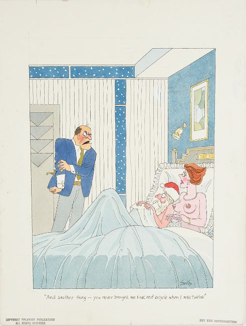 “And another thing – you never brought me that red bicycle when I was twelve” Unpublished cartoon artwork for Playboy, drawn: Sept 1995, pen and ink with watercolour, on Daler board, signed lower right, caption below, Copyright Playboy Publications All Rights Reserved & Not For Reproduction stamps on lower margin, Smilby yellow dot verso, with dust sheet, together with artists rough workup for this artwork with artists notes in margins, signed lower right, ‘Ok color H’ in red crayon possibly by Hugh Hefner, (2)