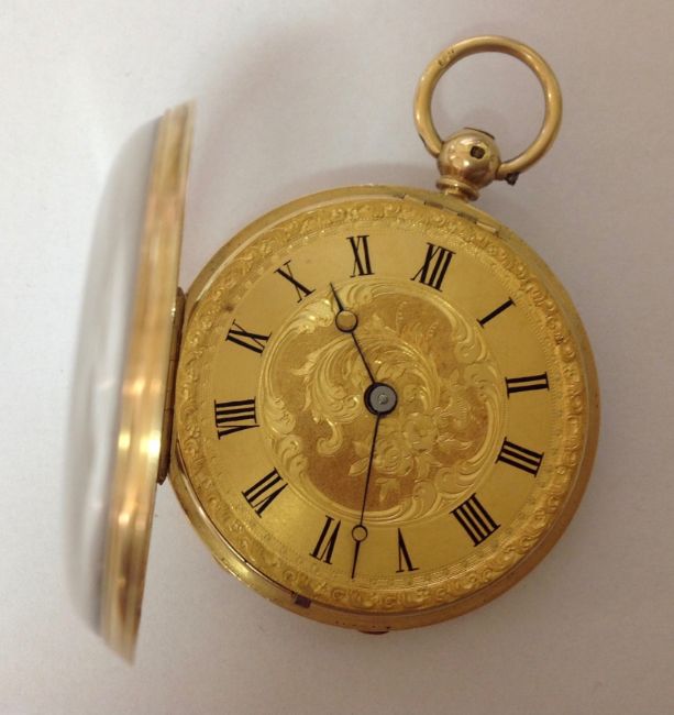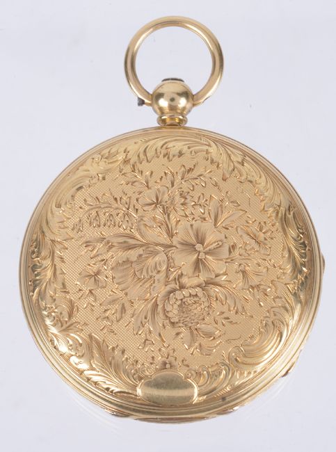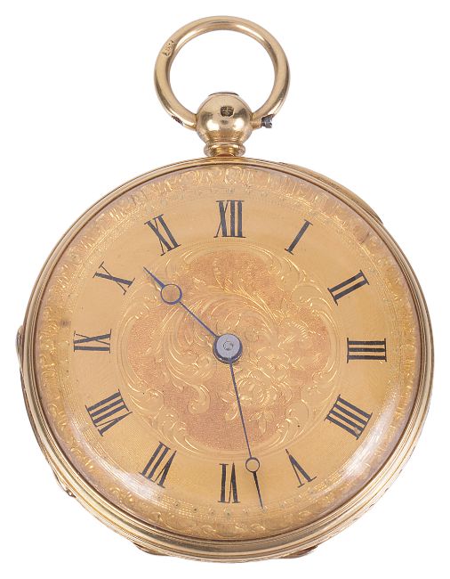 the gilt dial with roman hours, black spade hands, the case back engraved with foliate sprays