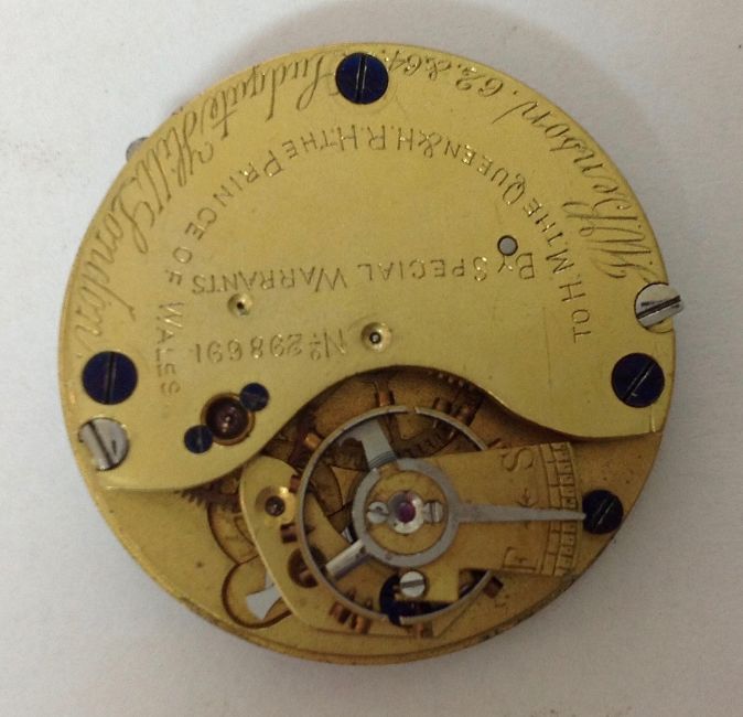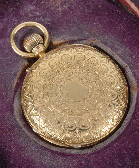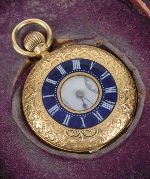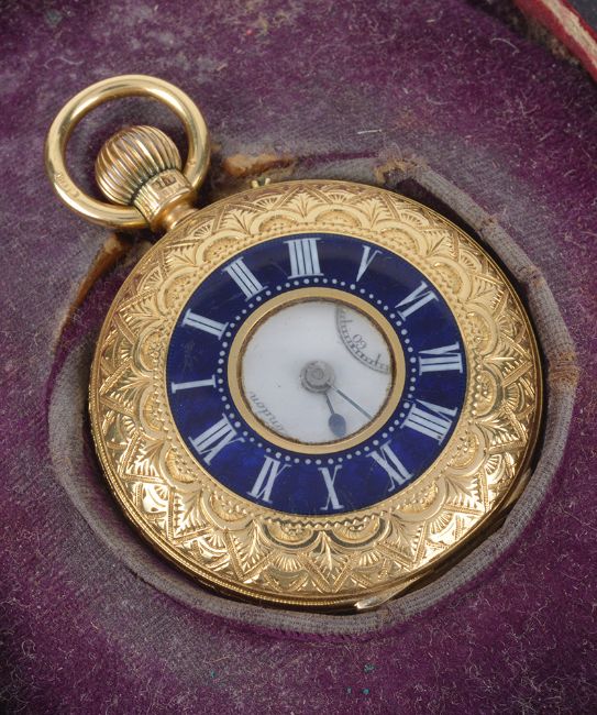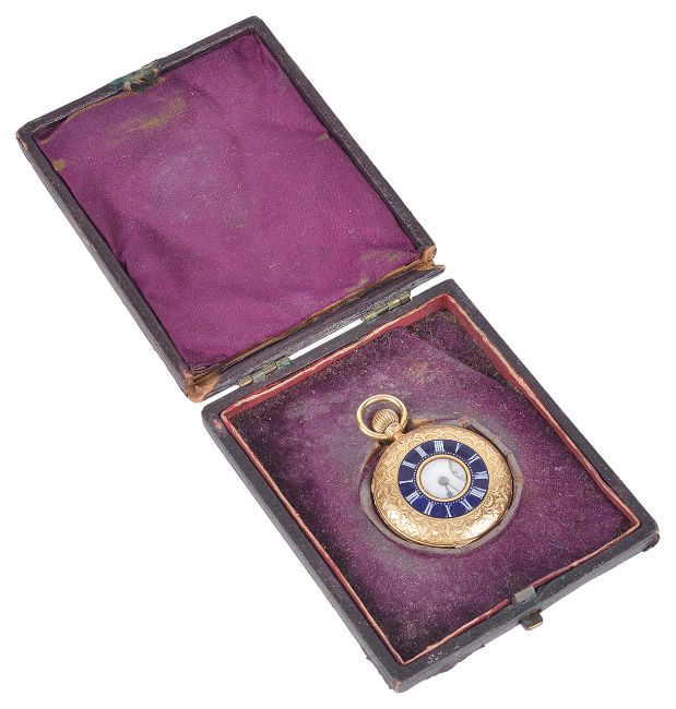 the white enamel dial with roman hours, spade hands and subsidiary seconds dial with J.W. Benson London, the case back engraved with foliate sprays, the front cover with blue enamel ring with white enamel roman numerals, in a fitted red leather case, (2)