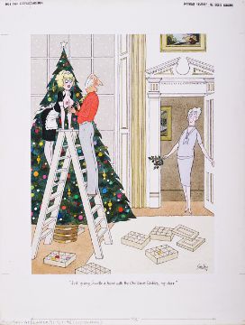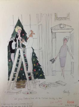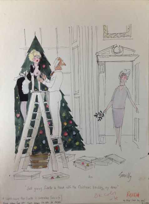 cartoon artwork for Playboy Dec 1981 pg.319, drawn: Jul 1981, pen and ink with watercolour, on Arne board, signed right, caption below, artists notes in margins, Copyright Playboy All Rights Reserved stamp & Playboy Publications Inc Reproduction Prohibited Without Permission upper margin & verso, Smilby yellow dot verso, with dust sheet, together with artists rough workup for this artwork with artists notes in margins, signed lower right, ‘Ok color – H’ in red crayon possibly by Hugh Hefner, (2)