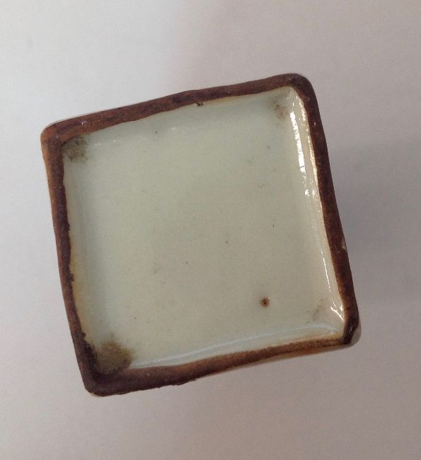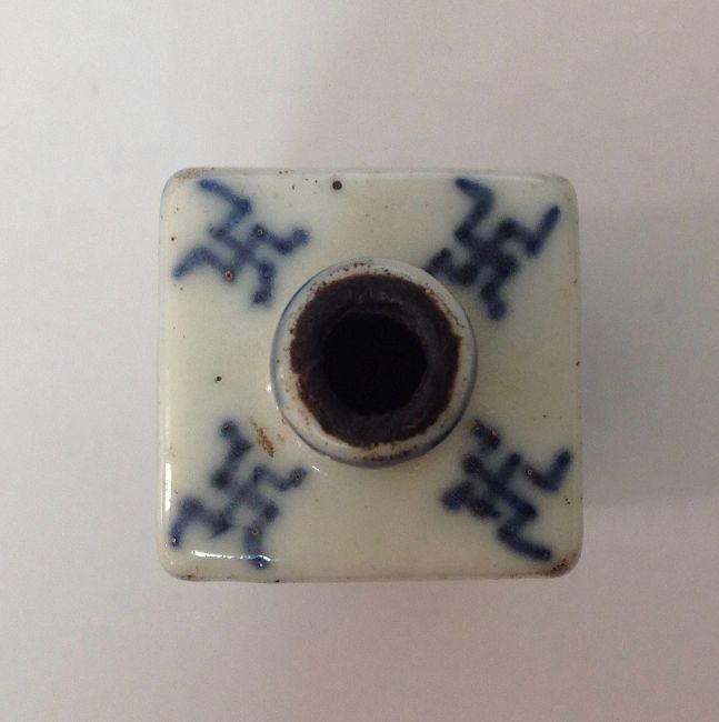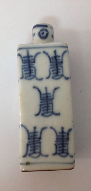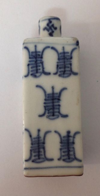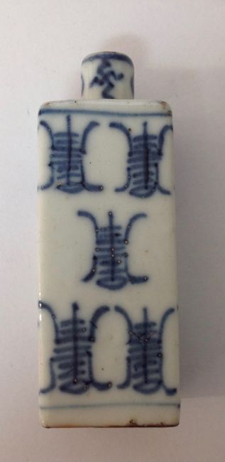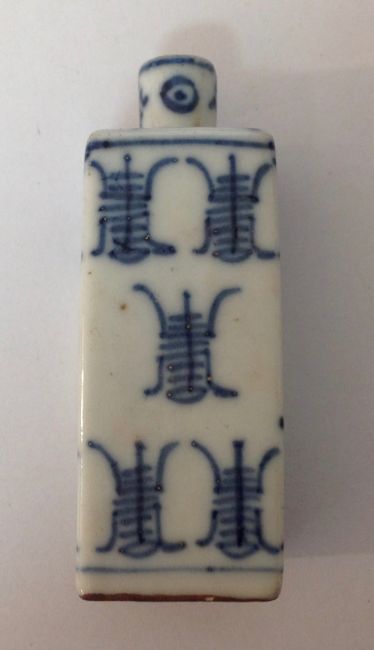 painted with scrolling chrysanthemums, together with a blue and white porcelain snuff bottle of square section (2)