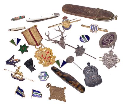 including a silver London Rifle Brigade South African campaign badge, Royal Warwickshire sweetheart pin (tests for gold), a silver stag brooch, two miniature penknives and other related items (qty)