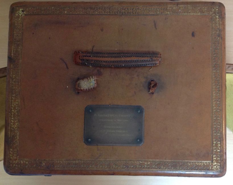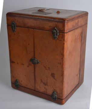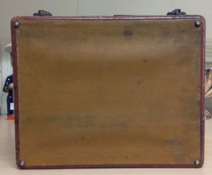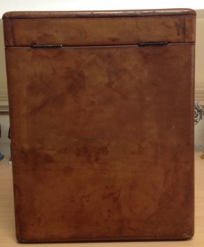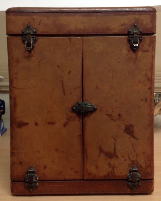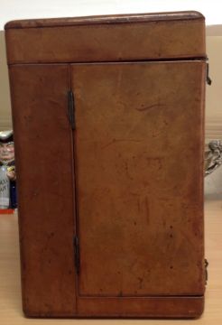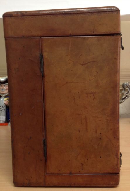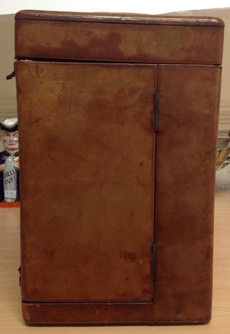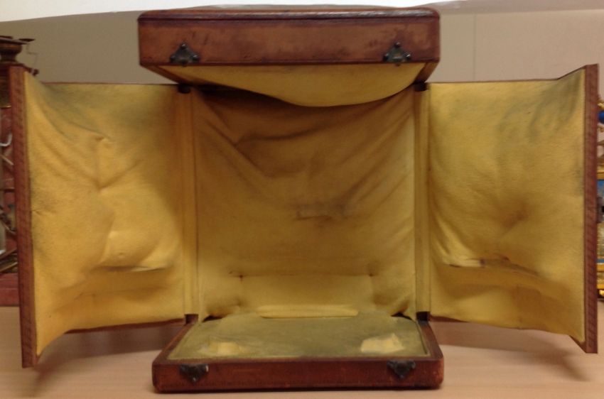 Condition: Fair to good, with wear throughout, minor scratches to gilt highlights on base, minor surface scratches to base, minor surface dirty to biscuit, leather case handle is damaged and in case, case leather faded in colour, hinges/metal clasps stiff to open/close