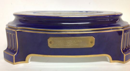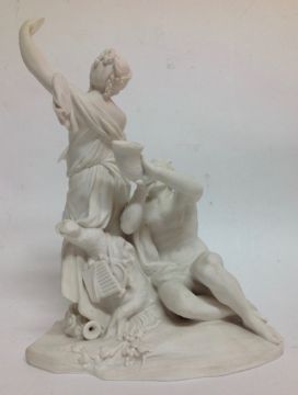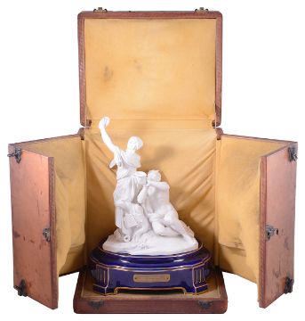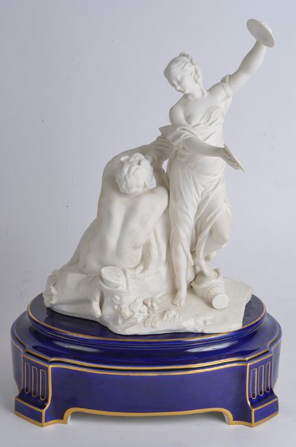 the group depicting Bacchante playing cymbals and Satyr seated playing a trumpet on a grassy bank, marks verso Serves 1912, raised upon a blue porcelain and gilt highlighted oval base, with gilt metal plaque engraved 'Group Cymbales' biscit de la manufacture Nationale de Sevres', bearing black stamp to underside S,96 Dore a Sevres 96, in a fitted chamois leather cushioned and leather stitched carrying case, with a metal plaque engraved 'M Ralph George Dinwiddy Lieutenant de Vaisseau remerciements de la Marine Francaise Portsmouth June 1913', (3)