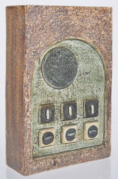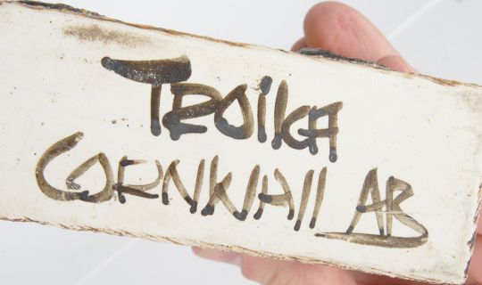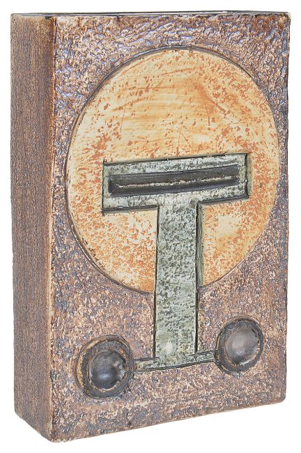 of rectangular form with brown ground and abstract decoration, bears painted factory and artists marks to base