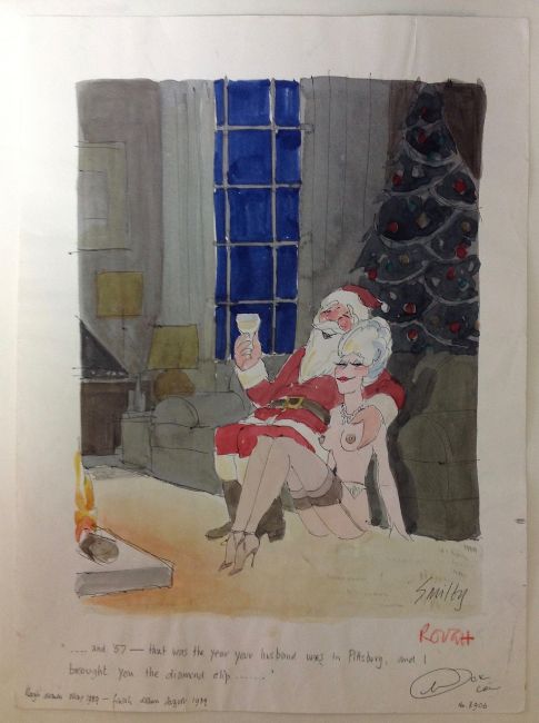 cartoon artwork for Playboy pub. Dec 1992 p.234, drawn: Aug 1989, pen and ink with watercolour, on Daler board, signed lower right, caption below, Copyright Playboy Publications All Rights Reserved & Not For Reproduction stamps upper margin, Smilby yellow dot verso, with dust sheet, together with artists rough workup for this artwork with artists notes in margins, signed lower right, (2)