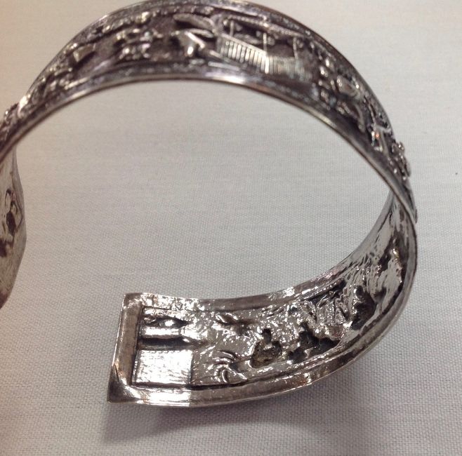 the bangle finely detailed in relief with a continuous figural village frieze of seated scholars, attendants and other related figures and buildings