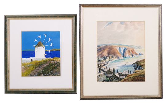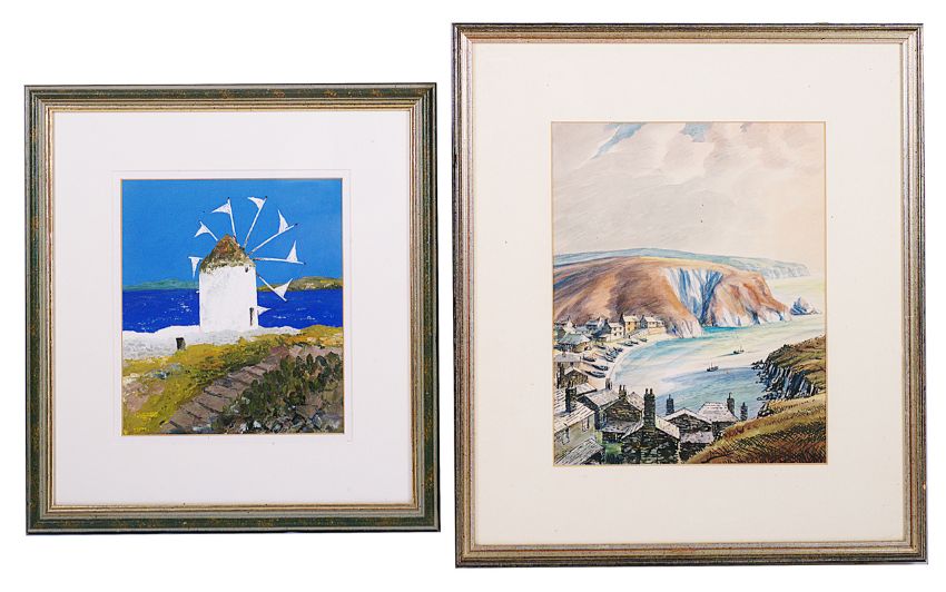 original artwork for the dust cover of 'A Sunset Touch' by Howard Spring, published by Collins 1953, framed; and the original artwork signed Gorham for the dust wrapper of 'The Companion Guide to the Greek Islands' by Ernle Bradford, published by Collins 1963, framed, (2)