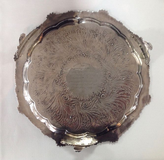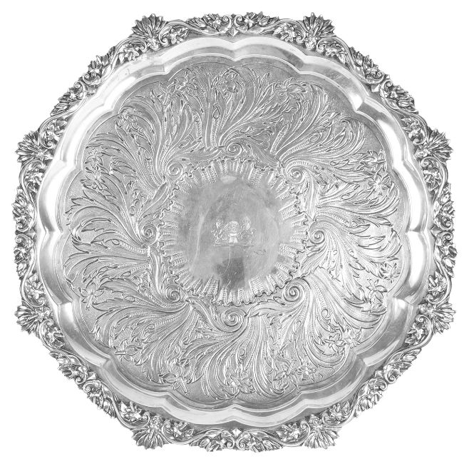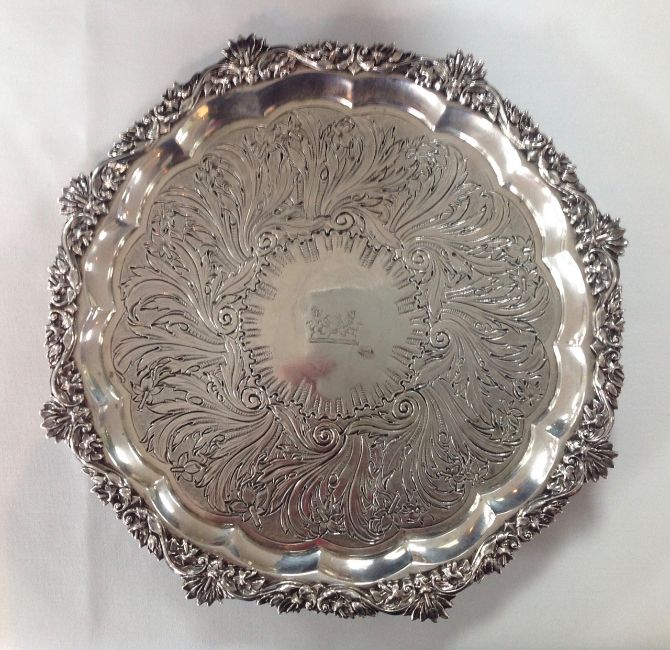 the pie crust edge with applied foliate border, the centre engraved with crest surrounded by scrolling acanthus leaf band, raised upon three flowerhead scrolled supports, the underside engraved 'To John Winstone Esq in grateful remembrance of his kindness to I.H. Barnett during his minority. This trifling testimonial is presented by his Father John Barnett 1831 - Acta exteriora Indicant Interiora Sacreta'