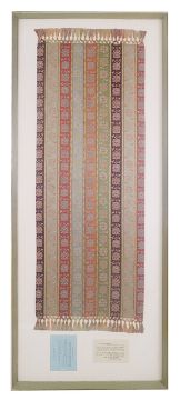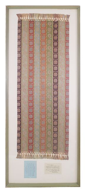 woven in the traditional manner in coloured silks of the same colour as the original brocade woven in the Tempyo Eras (645-781), in large presentation frame with original information incorporated in the frame