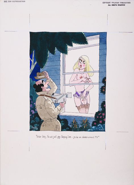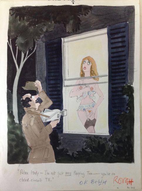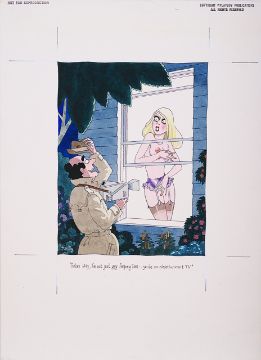 cartoon artwork for Playboy Nov 1981 pg.268, drawn: Jul 1981, pen and ink with watercolour, on Daler board, signed left, caption below, Copyright Playboy All Rights Reserved stamp & Playboy Publications Inc Reproduction Prohibited Without Permission upper margin & verso, Smilby yellow dot verso, with dust sheet, together with artists rough workup for this artwork with artists notes in margins, unsigned, ‘Ok B + W H’ in blue crayon possibly by Hugh Hefner, (2)