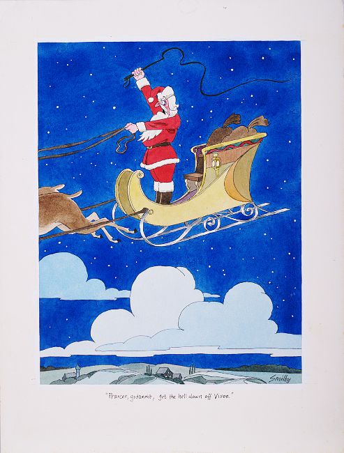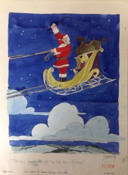 cartoon artwork for Playboy Germany Dec 1988 drawn: Jun 1988, pen and ink with watercolour, on Daler board, signed lower right, caption below, Smilby yellow dot verso, with dust sheet, together with artists rough workup for this artwork with artists notes in margins, signed lower right, (2)