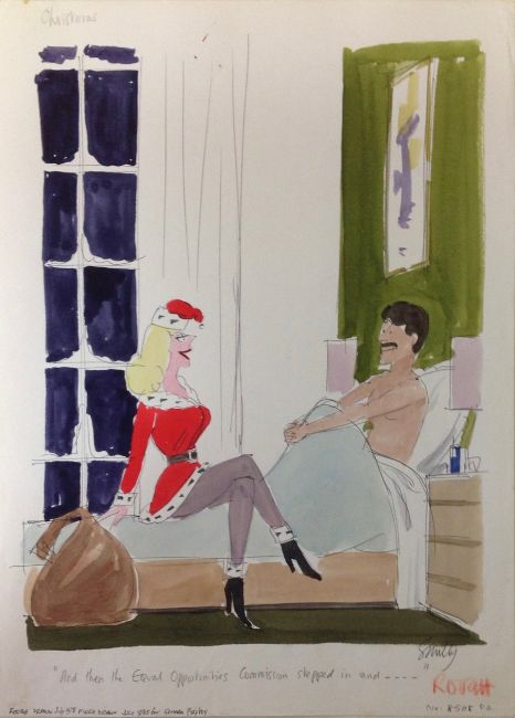 cartoon artwork for Playboy Germany Dec 1991 pg.81, drawn: Jul 1985, pen and ink with watercolour, on Daler board, signed lower left, caption below, with dust sheet, together with artists rough workup for this artwork with artists notes in margins, signed, (2)