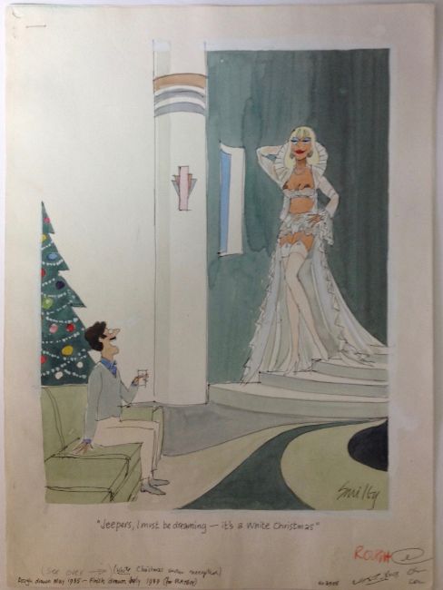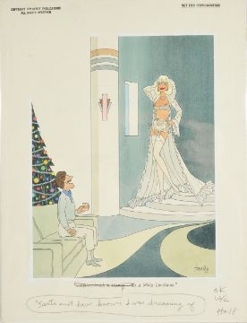 (Jeepers, I must be dreaming – it’s crossed out in pencil, “Santa must have known I was dreaming of” written in pencil), cartoon artwork for Playboy publ. Dec 1994 p.165, drawn: July 1989, pen and ink with watercolour, on Daler board, signed lower right, caption below, artists notes in margin, Copyright Playboy Publications All Rights Reserved & Not For Reproduction stamps upper margin, Smilby yellow dot verso, with dust sheet, together with artists rough workup for this artwork with artists notes in margins, signed lower right and another rough drawing, (3)