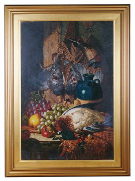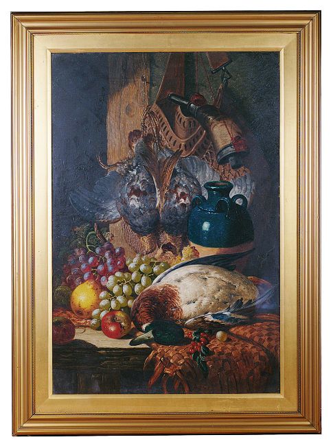 'Still life of game, fruit, cider flagon and powder horn', oil on canvas, signed lower right C. T. Bale, mounted and framed with label to verso