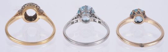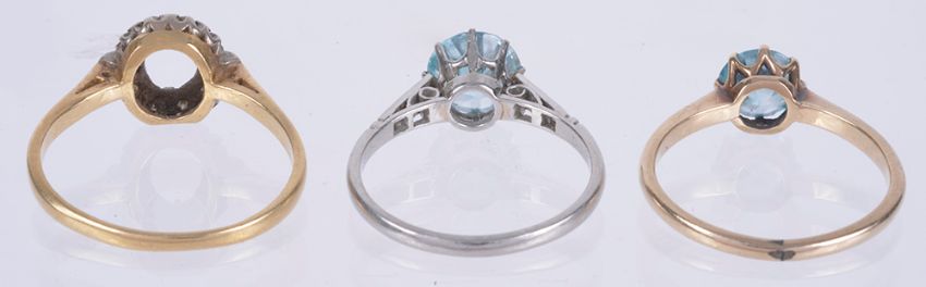 the single blue zircon in white metal mount and having diamond set shoulders, together with a single 9ct gold mounted blue gem set ring and an 18ct gold diamond set ring mount, centre stone absent (3)
