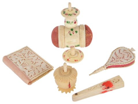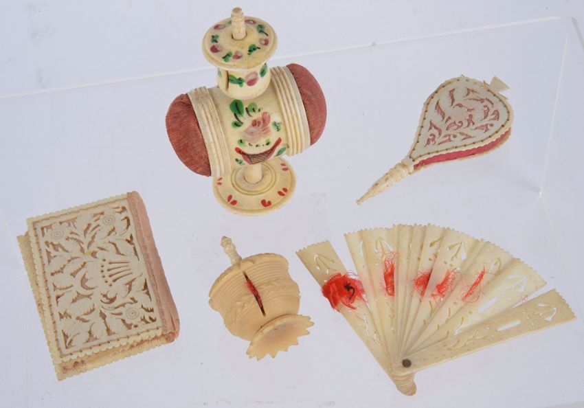 comprising a combined bone tape measure and double ended pin cushion hand painted with floral decoration, together with a Georgian bone pin cushion in the form of bellows pierced decoration, and a needle case in the form of a book of similar design; a miniature bone fan and a vegetable ivory tape measure (5)