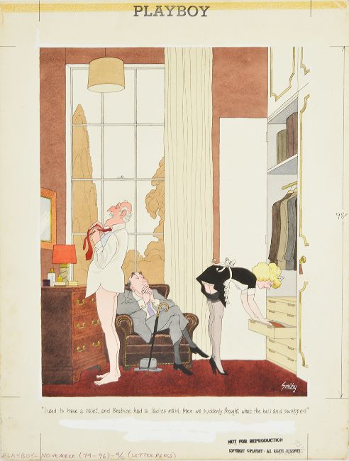 cartoon artwork for Playboy pub. Nov 1974 p.241, drawn: Apr 1974, pen and ink with watercolour, on Daler board, signed lower right, caption below, artist’s notes lower margin, Copyright Playboy Publications All Rights Reserved & Not For Reproduction stamps upper margin, Playboy stamp upper margin, Smilby yellow dot verso, with dust sheet