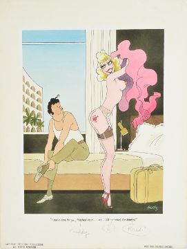 unpublished cartoon artwork for Playboy Germany, drawn: Sep 1982 , pen and ink with watercolour, on Daler board, signed lower right, caption below, artists hand written notes in pencil Manfred crossed out with a line down to Freddy/Fred, Copyright Playboy Publications All Rights Reserved & Not For Reproduction stamps on lower margin, Smilby yellow dot verso, with dust sheet
