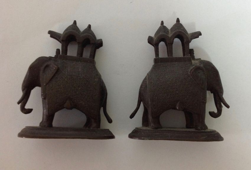 three George IV teaspoons, hallmarked Edinburgh, makers mark IL, together with two Victorian teaspoons, hallmarked London 1839 and two Victorian silver teaspoons, hallmarked Glasgow 1862 and two cast bronze elephant figures each carrying a howdah, a/f, (9)