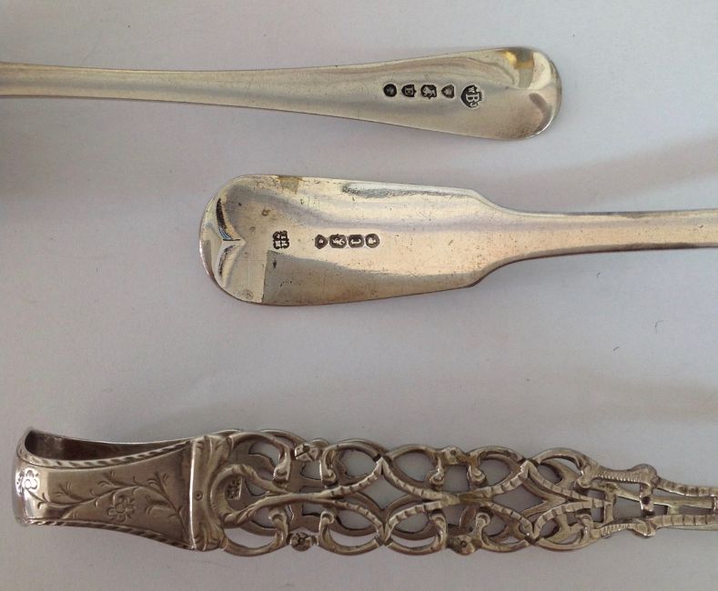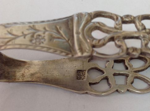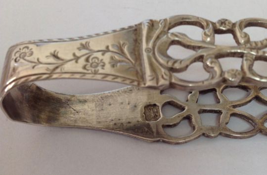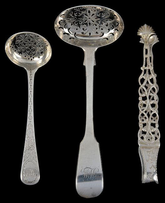 hallmarked London 1858, with pierced bowl by H J Lias & Sons, togther with another silver sifter spoon hallmarked London 1880, with pierced bowl by Walter & John Barnard and a silver sugar nips, hallmarked London, with pierced scrolled sides possibly by James Stamp & John Baker, (3)