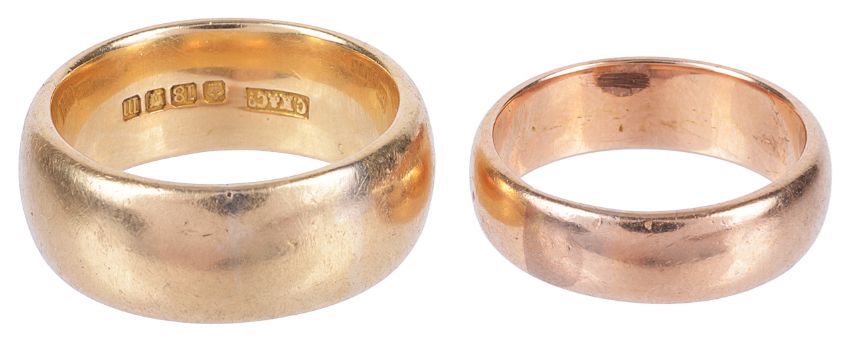 the former wedding band marked for London 1907, the latter of yellow metal, tests for gold (2)