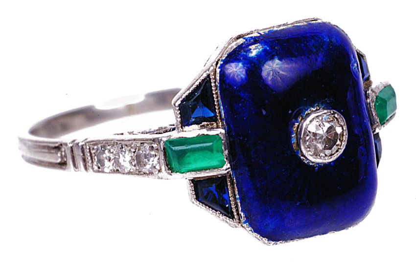 having deep blue enamel centre set with a single collet mounted diamond with an emerald baguette and fancy shaped small sapphires to either side and having further diamond detail to the shoulders