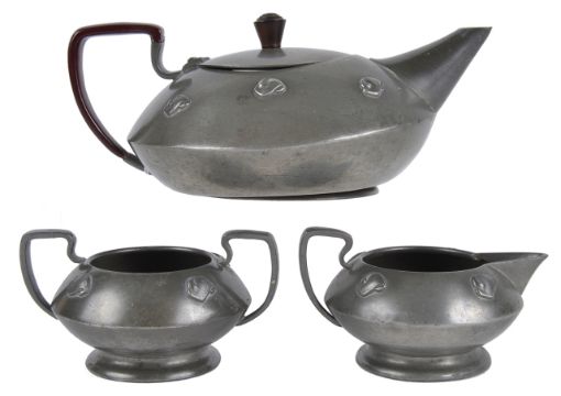 An Arts and Crafts Warric pewter three piece tea service