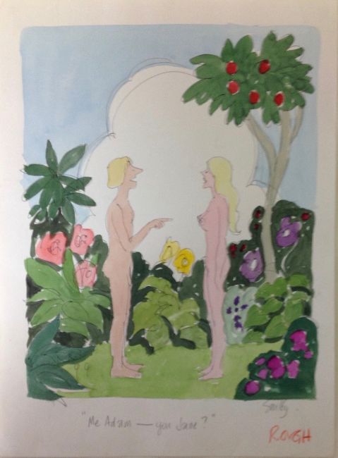 cartoon artwork for Playboy Germany 1980’s, drawn: Oct 1983, pen and ink with watercolour, on Daler board, signed right, caption below, Smilby yellow dot verso, with dust sheet, together with artists rough workup for this artwork with artists notes in margins, signed lower right, (2)