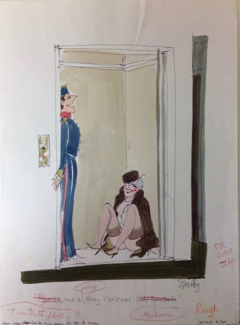 cartoon artwork for Playboy Dec 1980 pg.335, drawn: Jul 1980, pen and ink with watercolour, on Arne board, signed right, caption below, artists notes in margins, Copyright Playboy All Rights Reserved stamp & Playboy Publications Inc Reproduction Prohibited Without Permission lower margin & verso, Smilby yellow dot verso, with dust sheet, together with artists rough workup for this artwork with artists notes in margins, signed lower right,’Ok color – H’ in red pen possibly by Hugh Hefner, (2)