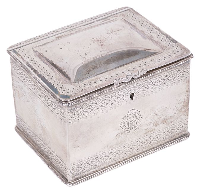 of rectanuglar form with hinged domed top lid with guilloche border, the sides with foliate chased borders, the front with locking mechanism and engraved initials, by Martin Hall & Co