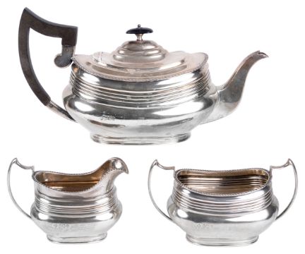 the teapot with ribbed body and ebonised handle, the twin handled sugar basin and cream jug with gadrooned edge, by Jay, Richard Attenborough Co Ltd, (3)