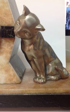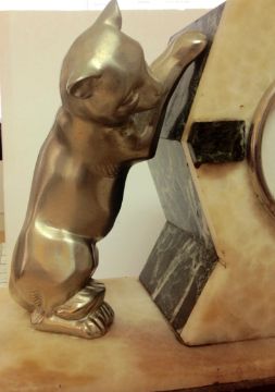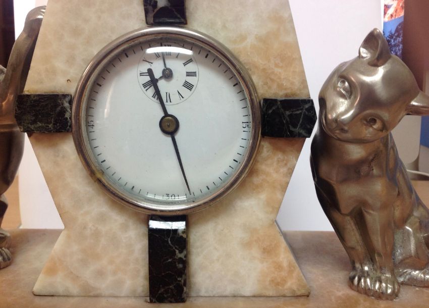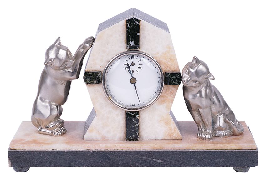 central clock in an alabaster and marble surround, flanked by two playful cats upon an alabaster marble base