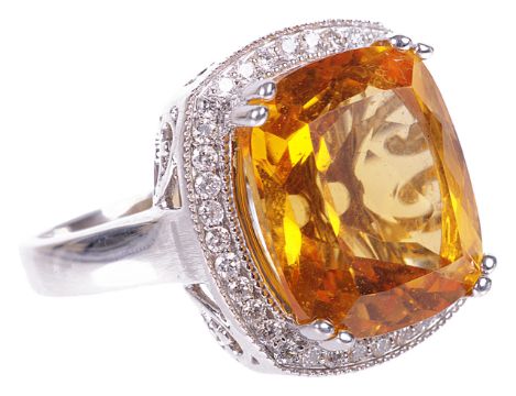 the central cushion cut citrine approximately 18.03ct set within a single row diamond cluster and raised on a high pierced scroll setting, white metal mount marked .750 for 18ct white gold, in associated ring box