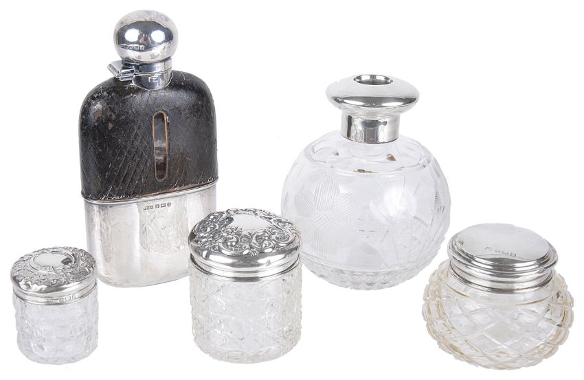 comprising a half leather covered hip flask with viewing window and a silver cup and silver top both hallmarked Sheffield 1890, one side engraved 'Edith', together with an assorted small collection of silver topped jars, (5)