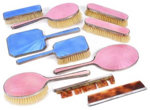 a clothes and hair brush with hand mirror with blue enamel backs, hallmarked London 1940, by Mappin & Webb; two hair and clothes brushes with a hand mirror with pink enamel back, hallmarked London 1938, by Mappin & Webb, together with two combs and a comb back, (11)