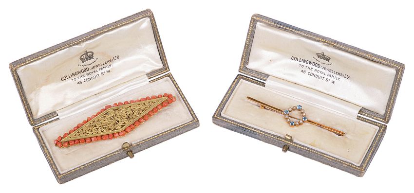 the bar brooch marked 15ct and in associated Collingwood Ltd. box, together with a fancy silver gilt (tests), elongated triangular 'coil work' brooch with wired coral bead border in associated Collingwood Ltd. box (2)