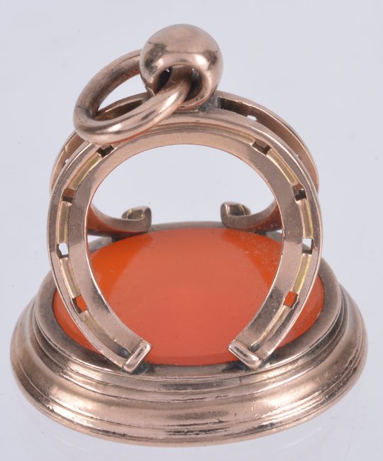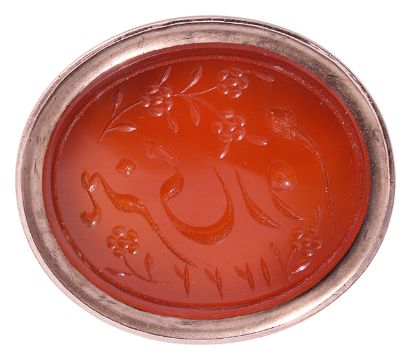 the large oval carnelian seal set in yellow/rose metal mount, tests for gold and having two curved horseshoe supports, the intaglio carved with flowers and script