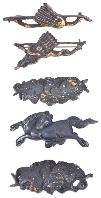 one of a prancing horse with gold detail and with silver brooch mount, two similar menuke of a bow also with gold detail and with silver brooch mounts, together with two un-mounted menuke (5)