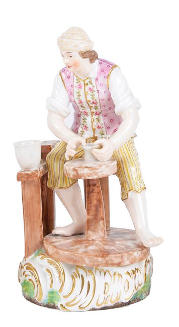 realistically modelled, the painted figure of a potter at his wheel, raised upon a acanthus scroll base, puce factory marks to base