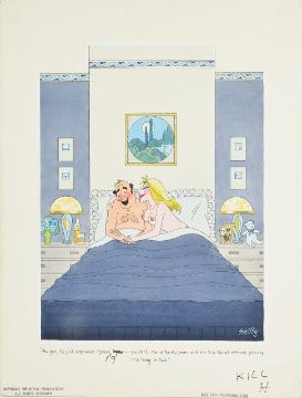 ‘honey’ crossed out in ink, Unpublished cartoon artwork for Playboy, drawn: Dec 1990, open and ink with watercolour, on Daler board, signed lower right, caption below, artists notes lower margin, Copyright Playboy Publications All Rights Reserved & Not For Reproduction stamps on lower margin, 'Kill H' in lower margin possibly by Hugh Hefner, Smilby yellow dot verso, with dust sheet