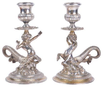 A pair of Continental silver cast candlesticks in the form of a pair of centurion sea gods (ichthyocentaurs)