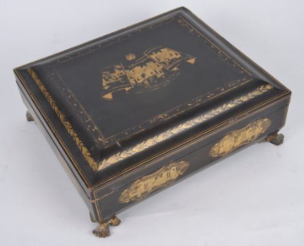 of rectangular form, with gilt decoration to the sides, lid and interior, the lid opening to reveal a fitted interior with several compartments and gaming trays, with four claw feet