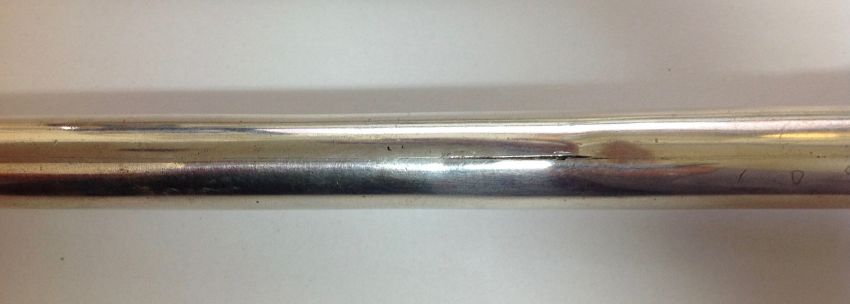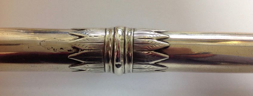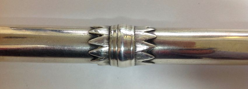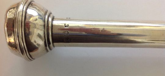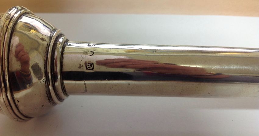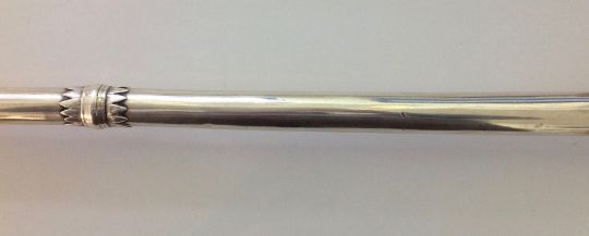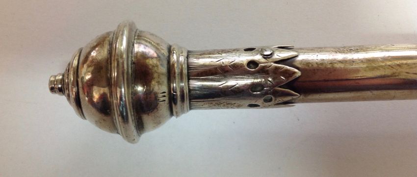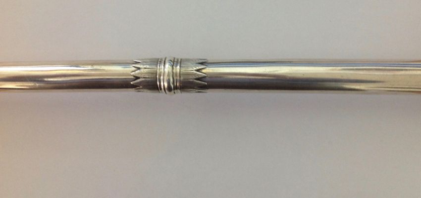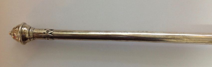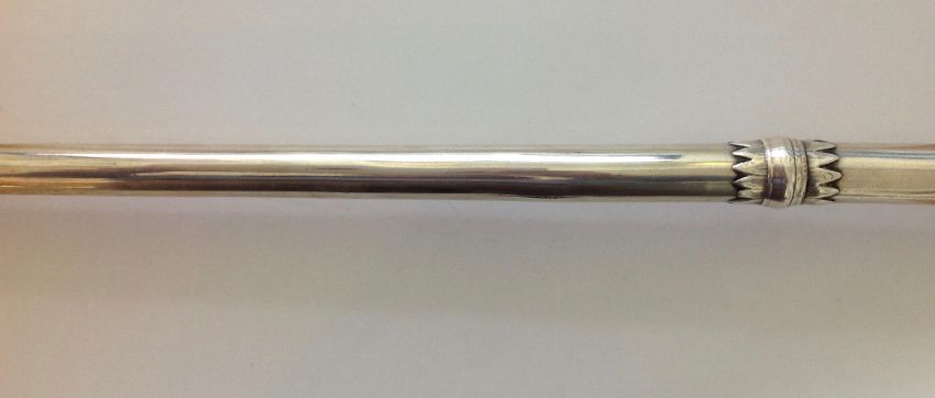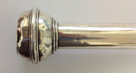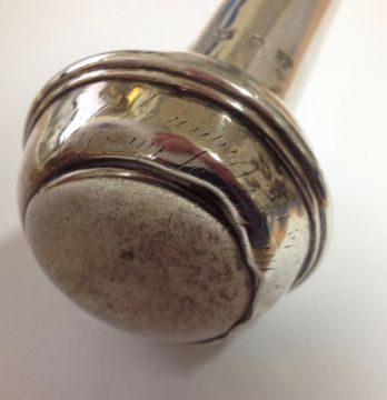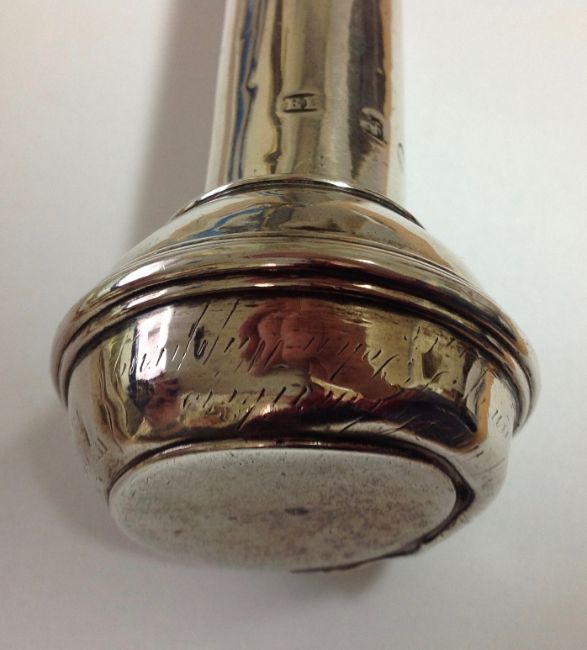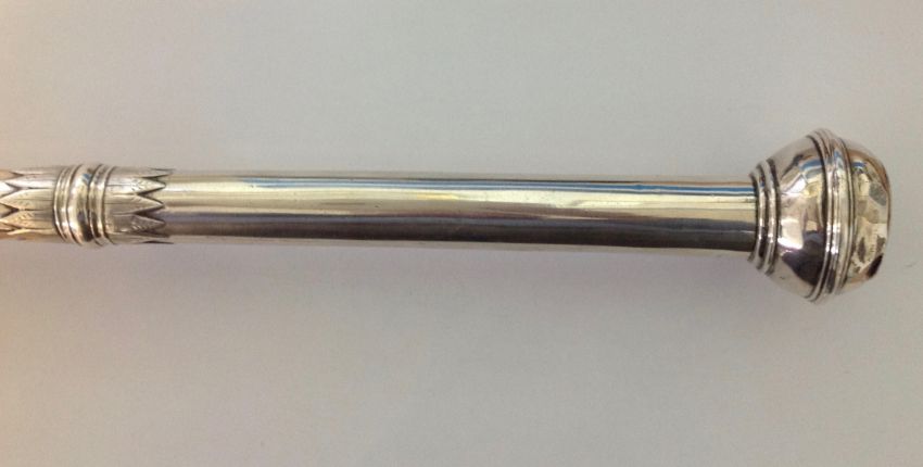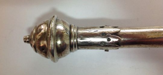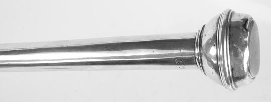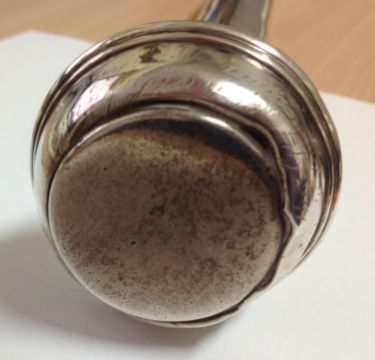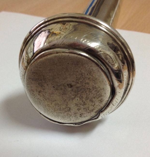 Condition: Fair to good, with wear throughout, dents and scratches to the pommel top which is slightly out of shape, minor split to the silver shaft, dents and scratches to the knopped base, loaded shaft