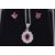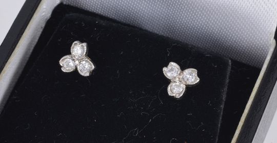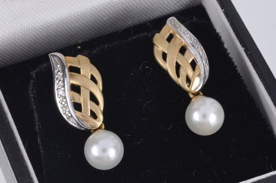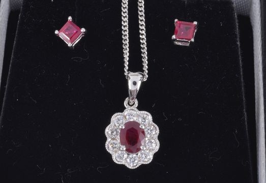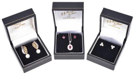 to include an 18ct white gold ruby and diamond cluster pendant on chain, a pair of 18ct white gold mounted square cut ruby stud earrings, a pair of 9ct gold fancy two colour cultured pearl drop earrings and a pair of small 9ct white gold mounted small diamond set trefoil earrings, together with three associated boxes (4)