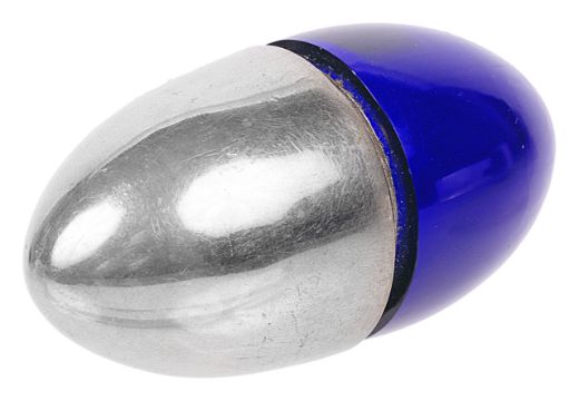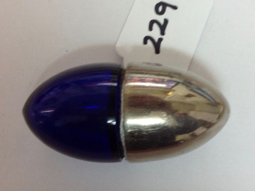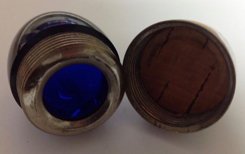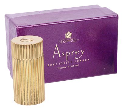 contained within a leather pouch and contained within an Asprey card outer case, together with a glass and silver plate perfume/smelling salts holder of ovoid form (2)