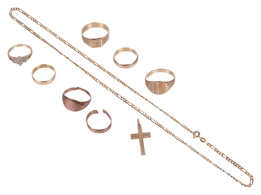comprising 9ct gold chain, engraved cross pendant, gentleman's diamond set ring and five other 9ct gold rings including two wedding rings a.f. (Q)