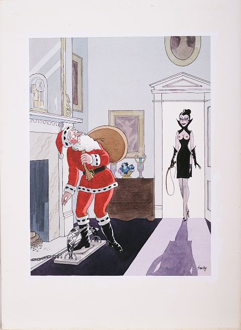 cartoon artwork for Playboy Germany Dec 1984 pg.93, drawn: Aug 1982, pen and ink with watercolour, on Daler board, signed lower right, uncaptioned, Smilby yellow dot verso, with dust sheet