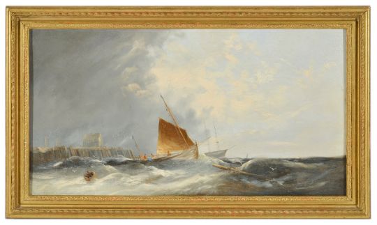 'Stormy seas' signed W H Williamson 1870 lower left, oil on canvas, gilt frame, bear paper label verso