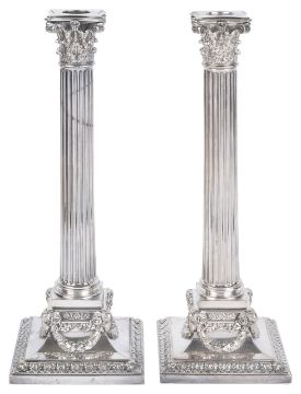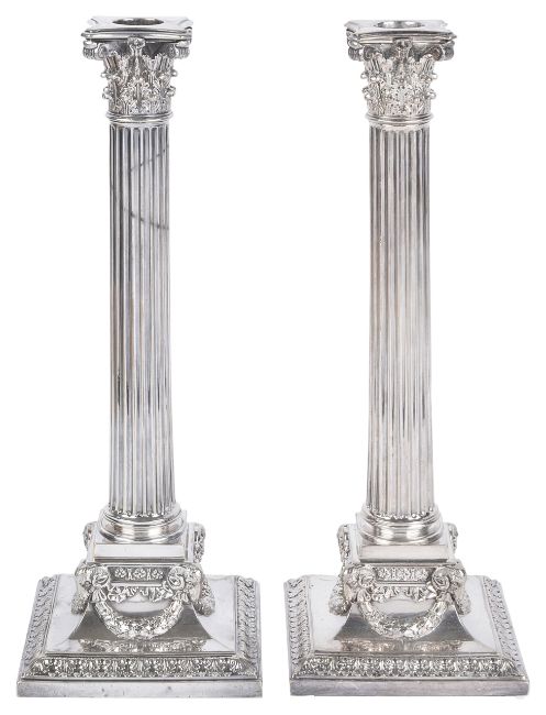 each with canted drip trays, with corinthian columns upon a square sectioned base with applied acanthus leaf border, decorated with garlands and rams heads, bearing hallmarks, (2)